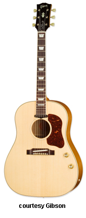 J-160 E | - slope shouldered body, spruce top, round soundhole, tortoiseshell pickguard, two-stripe bound body/rosette, mahogany back/sides/neck, 15/19-fret bound rosewood fingerboard with pearl block/trapezoid inlay, rosewood bridge with white pins, adjustable saddle, blackface peghead with pearl crown/logo inlay, three-per-side nickel tuners, single coil pickup, volume/tone control, available in Sunburst finish, over 4,400 mfg. 1954-1979. |