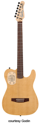 GODIN | ACOUSTIC ELECTRIC: ACOUSTICASTER SERIES | Early Acousticaster models have a black or creme colored controls plate in the bass horn bout. | ACOUSTICASTER 6 (MODEL 3518) | - single cutaway semi-hollow maple body, solid spruce top, fan bracing with mechanical harp (18 tuned metal tines), rock maple neck, 25.5 in. scale, 22-fret maple or rosewood fingerboard with offset dot inlay, six-per-side gold tuners, rosewood bridge with white bridgepins, L.R. Baggs bridge transducer, volume/active three-band EQ, available in Black High Gloss finish (maple fingerboard: 3471; rosewood fingerboard: 3518), disc. |