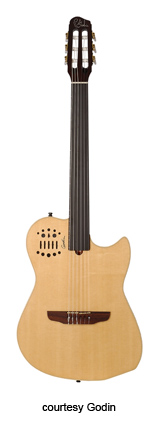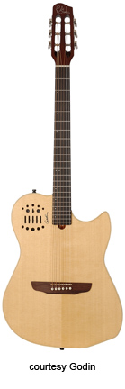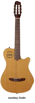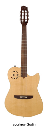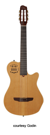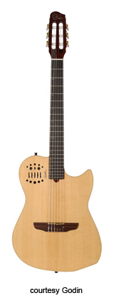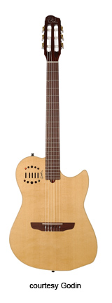 GODIN | ACOUSTIC ELECTRIC: MULTIAC SERIES | All MultiAc semi-acoustic models feature a dual-chambered mahogany body, solid spruce top, and mahogany neck. Synth Access models have an RMC hexaphonic multi-sensor, while the Duet models feature the L.R. Baggs Duet system. | MULTIAC NYLON STRING WITH SYNTH ACCESS (MODEL 4690/4713) | - nylon string configuration single cutaway two-chambered mahogany body, bound spruce top, mahogany neck, 22-fret ebony fingerboard with offset dot inlay, five small soundholes on upper bass bout, slotted peghead with "R. Godin" signature logo, three-per-side gold tuners with pearloid buttons, rosewood tied bridge, six individual micro transducer bridge saddles, RMC hexaphonic multi-sensors, volume/three-band EQ/synth volume slider controls, two synth (program up/down) push buttons, on-board preamp, 13-pin connector for Roland GR series guitar synths, available in Natural Semi-gloss finish, 25.5 in. scale, current mfg. |