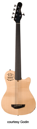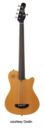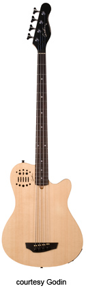 GODIN | ACOUSTIC ELECTRIC BASS | | A 4 SEMI-ACOUSTIC BASS (MODEL 10134) | - single rounded cutaway semi-hollow chambered maple body, solid cedar top, maple neck, 22-fret rosewood fingerboard with offset dot inlay, blackface peghead with Godin logo, four-on-one-side gold tuners, strings-through rosewood bridge, L.R. Baggs ribbon transducer, volume/three-band EQ slider controls, onboard preamp, available in Black (10585), CognacBurst (10141), or Natural (10134) Semi Gloss finish, 34 in. scale, disc. 2004. |