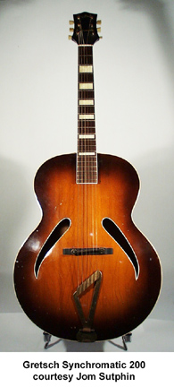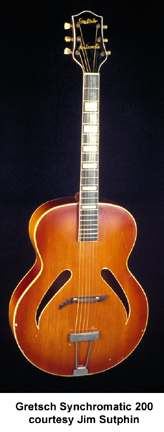 SYNCHROMATIC 200 | - carved spruce top, carved flame maple back, flame maple sides, two double-bound cat's-eye soundholes, wide multiple-binding on top and back, five-piece maple/rosewood neck, 14/20-fret bound rosewood fingerboard with hump block inlays, bound blackface headstock with indents above the E string tuners, pearl "Gretsch" logo on top and "Synchromatic" logo above the A and B-string tuners inlays, three-per-side chrome Grover tuners with engraved buttons, adj. stylized rosewood bridge, harp tailpiece, raised bound tortoiseshell pickguard, gold-plated hardware, available in Natural or Sunburst finish, 17 in. body width, 26 in. scale, mfg. 1939-1949. |