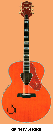 RANCHER SECOND REISSUE MODEL G6022 (NO. 260-0202) | - spruce top with G brand, bound triangle soundhole, tortoise pickguard with engraved steerhead, three-stripe bound body, maple back/sides/neck, 14/21-fret bound rosewood fingerboard with western motif engraved pearl block inlays, rosewood bridge with black white dot pins, bound peghead with pearl steerhead/logo inlay, three-per-side gold tuners, available in Orange Satin finish, mfg. 1991-present. |