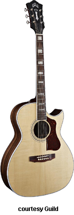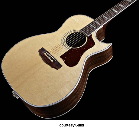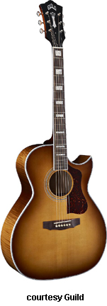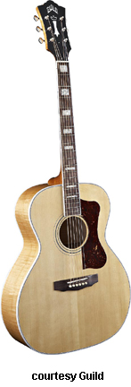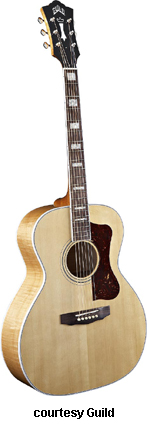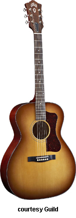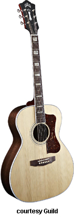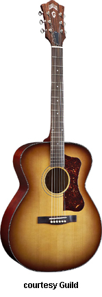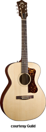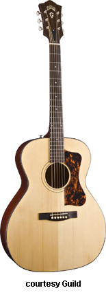 GF-30 | - folk style with a rounded bass bout, spruce top, flat maple back, maple sides, multi-ply top and back binding, maple neck, rosewood fingerboard with dot inlays, snakehead-style headstock with Chesterfield and Guild logo inlays, three-per-side chrome tuners, available in various finishes, 16 in. body width, 25.625 in. scale, designed by George Gruhn, mfg. 1987-1991. |