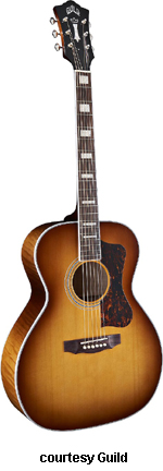 F-40 VALENCIA SECOND VERSION (NO. 380-6600) | - grand orchestra-style body, solid red spruce top, solid mahogany back and sides, round soundhole with rings, tortoise body binding, three-piece mahogany neck, 14/20-fret rosewood fingerboard with pearl dot inlays, rosewood headstock overlay with G and Guild logo inlays, three-per-side chrome Gotoh tuners, rosewood bridge, available in Antique Burst, Ice Tea Burst, or Natural finish, 25.5 in. scale, mfg. 2007-present. |