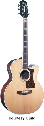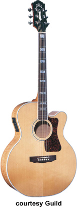GUILD | ACOUSTIC ELECTRIC: TRADITIONAL SERIES (F PREFIX) | All models in this series have single rounded cutaway folk style body, oval soundhole, tortoiseshell pickguard, three-stripe bound body/rosette, transducer pickup, volume/four-band EQ preamp system with built in phase reversal, unless otherwise listed. | F-4 CE (NO. 350-3006) | - single smooth cutaway body, solid spruce top, mahogany back and sides, oval soundhole, bound body, mahogany neck, 14/20-fret rosewood fingerboard with pearl dot inlays, three-per-side chrome tuners, rosewood bridge with white black dot pins, Fishman Acoustic Matrix system, available in Natural Hand Rubbed satin finish, case included, mfg. 1992-99. |