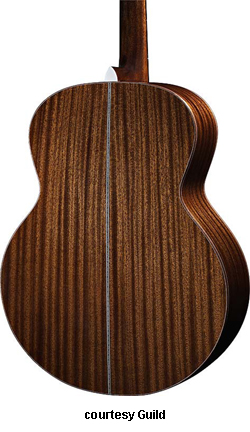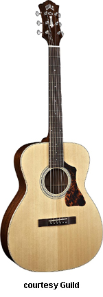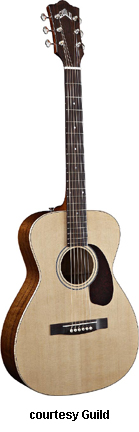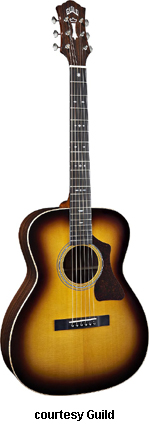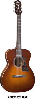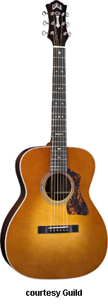 GAD-F40P (NO. 381-0800) | - grand orchestra style body based on the 1955 F-40 Valencia model, solid spruce top, solid African Padauk back and sides, round soundhole with rings, wood body binding, one-piece mahogany neck, dovetail neck joint, 12/20-fret rosewood fingerboard with diamond and snowflake inlays, Chesterfield and logo headstock inlays, three-per-side Grover chrome tuners, rosewood bridge with ebony pins, black pickguard, available in Amber Sunburst (2007-08), Ice Tea Burst (2007-08), or Natural finish, 25.5 in. scale, mfg. 2007-present. |