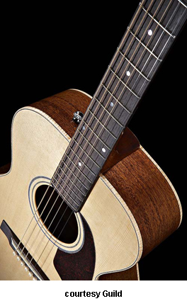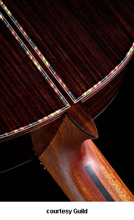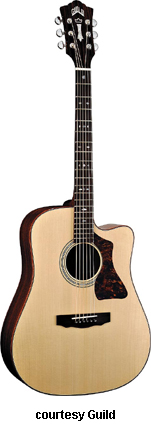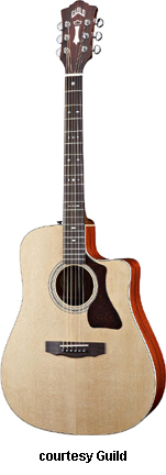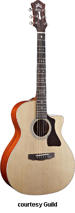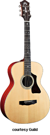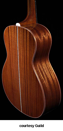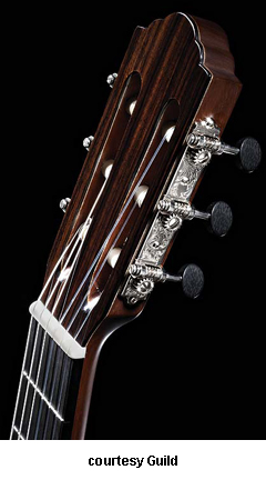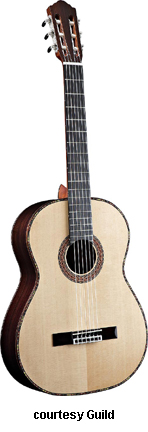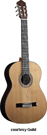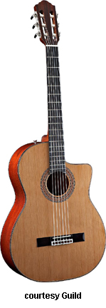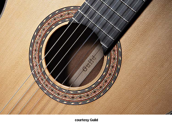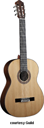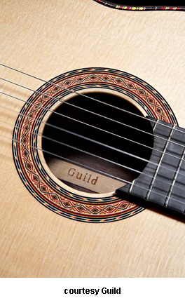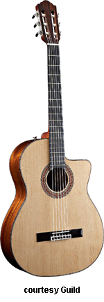 GUILD | ACOUSTIC: GAD SERIES | GAD stands for the Guild Acoustic Design series. Most guitars in this series are based on traditional designs including many Guild originals, and they are all built in China. | GAD-4N (NO. 381-0904) | - single cutaway Hauser nylon string classical body, solid spruce top, solid mahogany back and sides, special spruce bracing, round soundhole with wood rosette, wood body binding, one-piece mahogany neck with rosewood insert, 12/18-fret ebony fingerboard with no inlays, rosewood overlay slotted headstock with three-per-side open-style chrome tuners, rosewood bridge, Seymour Duncan Timber-line electronics, available in Natural finish, 25.59 in. scale, mfg. 2007-present. |