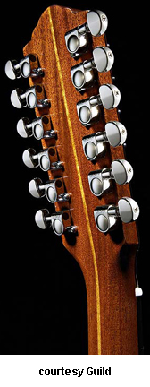 GAD-F212 12-STRING (NO. 381-3400) | - 12-string configuration, grand orchestra style body based on the 1955 F-40 Valencia model, solid spruce top, solid mahogany back and sides, round soundhole with rings, wood body binding, three-piece mahogany/maple neck, dovetail neck joint, 14/20-fret rosewood fingerboard with dot inlays, Chesterfield and logo headstock inlays, six-per-side Grover mini-chrome tuners, rosewood bridge with ebony pins, black pickguard, available in Ice Tea Burst (2007-08) or Natural finish, 25.5 in. scale, mfg. 2007-present. |
