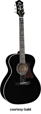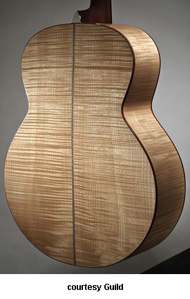 GAD-F40 (NO. 381-0600) | - grand orchestra style body based on the 1955 F-40 Valencia model, solid spruce top, solid flame maple back and sides, round soundhole with rings, wood body binding, one-piece mahogany neck, dovetail neck joint, 14/20-fret ebony fingerboard with diamond and snowflake inlays, Chesterfield and logo headstock inlays, three-per-side Grover chrome tuners, ebony bridge with ebony pins, black pickguard, available in Black, Blonde, or Ice Tea Burst (2007-08) finish, 25.5 in. scale, mfg. 2007-present. |
