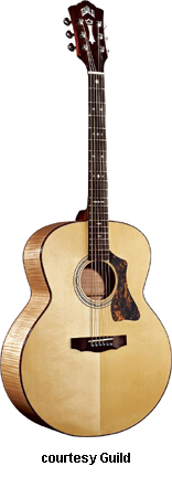 GAD-JF30 (NO. 381-3000) | - jumbo body, solid spruce top, solid AAA flamed maple back and sides, mahogany neck, 20-fret ebony fingerboard with diamond inlays, rosewood bridge, wood binding, clear pickguard, rosewood peghead cap, nickel hardware, available in Antique Sunburst, Blonde, or Ice Tea Burst (2004-08) finish, mfg. 2004-present. |