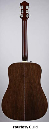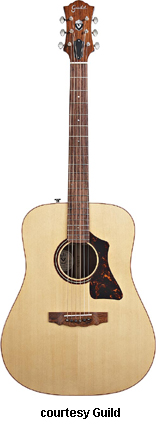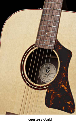 CD-1 (NO. 380-9990) | - dreadnought-style body, solid Sitka spruce top, solid rosewood back and sides, round soundhole with Madagascar rosewood and ivoroid, red, and black accent lines rosette, mutli-layer ivoroid binding, Guild neck block system, one-piece mahogany neck, 14/21-fret Madagascar rosewood fingerboard with abalone dot inlays, rosewood headstock overlay with MOP logo and shield inlay, three-per-side chrome Gotoh tuners, Madagascar rosewood bridge, tortoise shell pickguard, available in Antique Burst, Ice Tea Burst, or Natural finish, 25.5 in. scale, deluxe hardshell case included, mfg. summer 2008 only. |