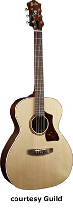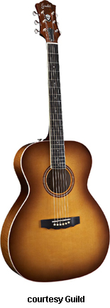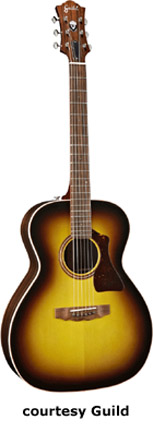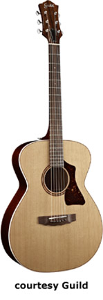 CO-2 (NO. 380-8000) | - F-30 Orchestra-style body, solid red spruce top, solid mahogany back and sides, round soundhole with Madagascar rosewood and ivoroid, red, and black accent lines rosette, mutli-layer ivoroid binding, Guild neck block system, one-piece mahogany neck, 14/21-fret ebony fingerboard with dot inlay, three-per-side Gotoh chrome tuners, ebony bridge, available in Antique Burst, Ice Tea Burst, or Natural finish, mfg. summer 2007-08. |