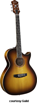 CV-1 (NO. 380-5000) | - F-40 Orchestra-style body, solid spruce top, Indian rosewood back and sides, round soundhole with Madagascar rosewood and ivoroid, red, and black accent lines rosette, mutli-layer ivoroid binding, Guild neck block system, one-piece mahogany neck, 14/21-fret Madagascar rosewood fingerboard with dot inlay, MOP headstock logo and inlay with three-per-side Gotoh tuners, Madagascar rosewood bridge and end pins, tortoiseshell pickguard, available in Antique Burst, Ice Tea Burst, or Natural finish, mfg. summer 2006-08. |