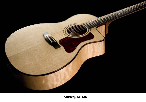 GIBSON | ACOUSTIC: SONGMAKER SERIES | Gibson's Songmaker Series are produced in St. John's, Newfoundland, Canada at the Garrison Guitar Factory. These guitars offer traditional shapes and styles with all solid woods and tasteful appointments. Gibson bought Garrison Guitars in mid-2007. | CQM | - Grand Concert-style body, solid spruce top, solid quilted maple back and sides, round soundhole with three-ring rosette, tortoise body binding, mahogany neck, 14/20-fret rosewood-bound ebony fingerboard with abalone dot inlays, black headstock overlay, three-per-side chrome Gibson tuners, ebony belly bridge, white bridge pins, tortoiseshell pickguard, Natural finish with High Gloss overcoat, 25.5 in. scale, hardshell case included, mfg. 2008-present. |