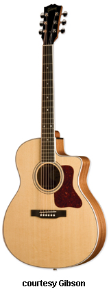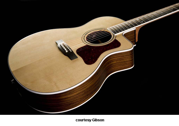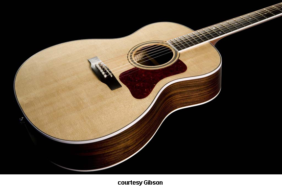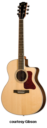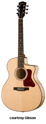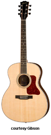 CSR | - Grand Concert-style body, solid spruce top, solid rosewood back and sides, round soundhole with three-ring rosette, white body binding, mahogany neck, 14/20-fret rosewood-bound ebony fingerboard with abalone dot inlays, black headstock overlay, three-per-side chrome Gibson tuners, ebony belly bridge, white bridge pins, tortoiseshell pickguard, Natural finish with High Gloss overcoat, 25.5 in. scale, hardshell case included, mfg. 2008-present. |
