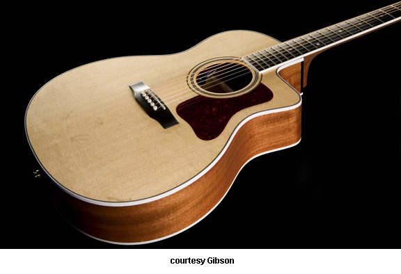 CSM | - Grand Concert-style body, solid spruce top, solid mahogany back and sides, round soundhole with three-ring rosette, white body binding, mahogany neck, 14/20-fret rosewood-bound ebony fingerboard with abalone dot inlays, black headstock overlay, three-per-side chrome Gibson tuners, ebony belly bridge, white bridge pins, tortoiseshell pickguard, Natural finish with High Gloss overcoat, 25.5 in. scale, hardshell case included, mfg. 2008-present. |
