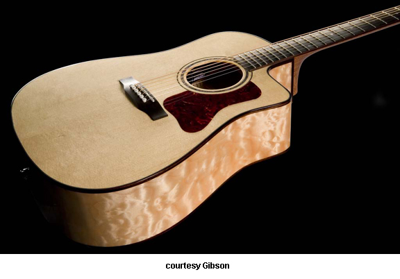 DQM | - Dreadnought-style body, solid spruce top, solid quilted maple back and sides, round soundhole with three-ring rosette, tortoise body binding, mahogany neck, 14/20-fret rosewood-bound ebony fingerboard with abalone dot inlays, black headstock overlay, three-per-side chrome Gibson tuners, ebony belly bridge, white bridge pins, tortoiseshell pickguard, Natural finish with High Gloss overcoat, 25.5 in. scale, hardshell case included, mfg. 2008-present. |