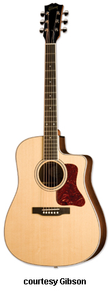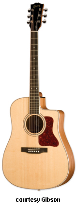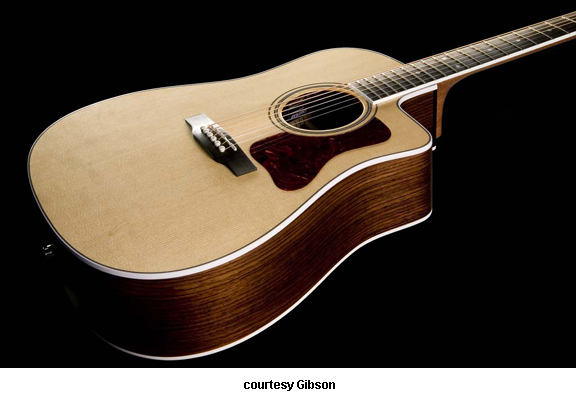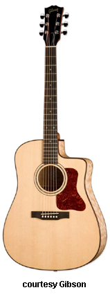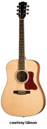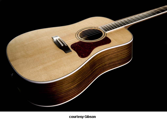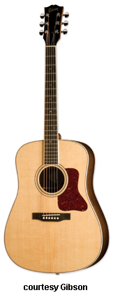 DSR | - Dreadnought-style body, solid spruce top, solid rosewood back and sides, round soundhole with three-ring rosette, white body binding, mahogany neck, 14/20-fret rosewood-bound ebony fingerboard with abalone dot inlays, black headstock overlay, three-per-side chrome Gibson tuners, ebony belly bridge, white bridge pins, tortoiseshell pickguard, Natural finish with High Gloss overcoat, 25.5 in. scale, hardshell case included, mfg. 2008-present. |