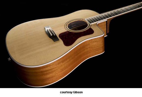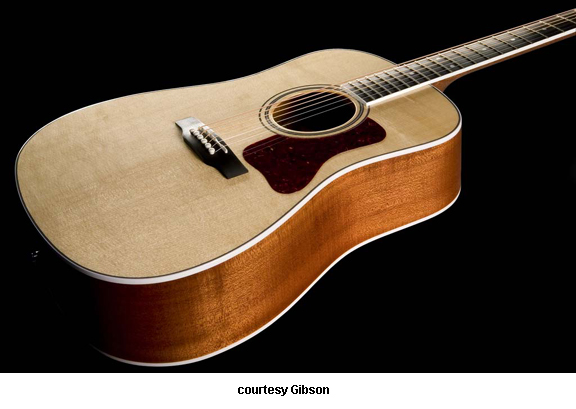 DSM | - Dreadnought-style body, solid spruce top, solid mahogany back and sides, round soundhole with three-ring rosette, white body binding, mahogany neck, 14/20-fret rosewood-bound ebony fingerboard with abalone dot inlays, black headstock overlay, three-per-side chrome Gibson tuners, ebony belly bridge, white bridge pins, tortoiseshell pickguard, Natural finish with High Gloss overcoat, 25.5 in. scale, hardshell case included, mfg. 2008-present. |