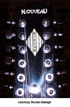 GIBSON | ACOUSTIC: NOUVEAU BY GIBSON SERIES | The Nouveau by Gibson Series feature bodies and necks that were produced in Japan and then shipped to the U.S. where they were assembled and completed. The Nouveau guitars were introduced into the Gibson line in 1986, but by late 1987, they were moved to the Epiphone line and changed to Nouveau by Epiphone. A line of electric guitars were offered as well. | NV 6 | - dreadnought-style body, spruce top, mahogany back and sides, round soundhole with three-ring rosette, multi-ply body binding, mahogany neck, 14/20-fret ebony fingerboard with custom shape inlays, black headstock overlay with pearl "Nouveau" logo across the top and seven-stripe pearl diamond inlay with a vertical "Gibson" logos three-per-side chrome tuners, ebony bridge, tortoise pickguard, available in Natural finish, mfg. 1986-87. |
