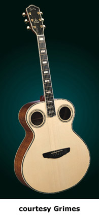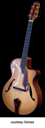 GRIMES GUITARS | Instruments currently built in Kula, HI since 1972. | Luthier Stephen Grimes originally apprenticed with a violin maker and set up his own mandolin shop in Port Townsend, WA in 1972, assembling archtop mandolins. In 1974, Grimes began handcrafting archtop guitars, as well as a few steel string flattop models. In 1982, Grimes introduced a semi-hollow archtop, two steel string flattops, and a half-sized flattop. Grimes also moved to Hawaii in 1982, and continues to produce guitars on a custom basis. Grimes estimates that he produces about twenty guitars a year (half of them are archtops, and half of them are double soundhole flattops in steel or nylon configurations). Customers have choices on size, woods used, color of finish, inlay work, electronic packages, and the neck profile. For more information, contact Grimes directly (see Trademark Index). | | ACOUSTIC |