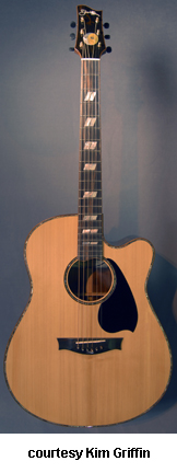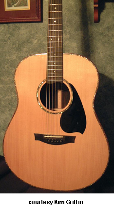GRIFFIN STRING INSTRUMENTS | Acoustic instruments currently produced in Greenwich, NY since 1976. | Luthier Kim Griffin was born in 1952 and began repairing string instruments of all types in 1975. He then attended the School of Guitar Research and Design in 1977 learning steel string and classical guitar building methods from George Morris and Charles Fox. Since then, he has built steel string acoustic and electric guitars, mandolins, banjos, and hammered dulcimers in Greenwich New York. Griffin builds custom one of a kind, hand built instruments and offers five different guitar shapes: A (parlor), B (00 size), C (classical), GC (grand concert), and D (rounded dreadnought). Prices start at $2,900 and a minimum deposit of $1,250 secures a place on the waiting list (currently 12- 18 months). For more information contact Griffin directly (see Trademark Index). | |