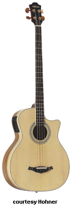 HOHNER | ACOUSTIC ELECTRIC BASS | | EAB40 | - single cutaway body, spruce top, oval soundhole, bound body, striped rosette, ashwood back/sides, mahogany neck, 22-fret rosewood fingerboard with white dot inlay, rosewood bridge, two-per-side chrome tuners, piezo bridge pickup, volume/four-band EQ controls, available in Natural finish, disc. 2001. |