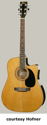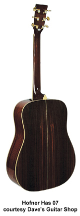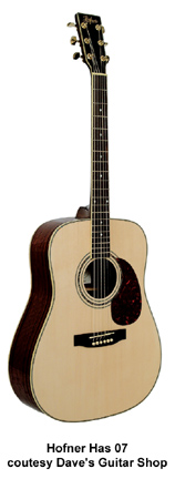 HÖFNER | ACOUSTIC: CURRENT FLATTOP MODELS | Höfner also offers a line of entry-level acoustic guitars. The Classic series feature laminated woods and standard appointments. Retail prices start at $459. The Master Luthier series feature all solid woods and they are built in Germany. Prices start at $2,399. | HAS01 | - dreadnought style, spruce top, catalpa back and sides, rosewood fingerboard and bridge, black pickguard, chrome hardware, Natural finish, disc. 2005. |