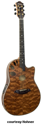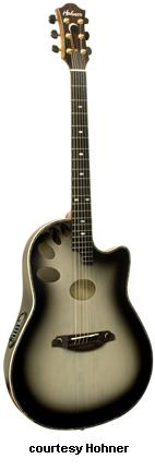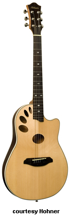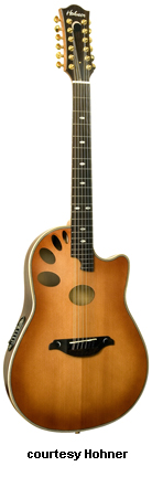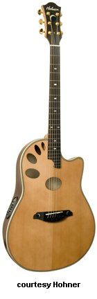 ECT60 | - travel-sized single cutaway bowlback-style body, spruce top, cross-woven spherical alder bowl back, small oval soundhole with four oval soundholes in the upper bass bout, ivoroid body binding, three-piece mahogany neck, 20-fret Sonokelin fingerboard with oval pearl inlays, three-per-side chrome tuners, Sonokelin bridge, available in Natural finish, mfg. 2007-present. |