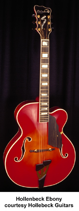 HOLLENBECK GUITARS | Instruments previously built in Lincoln, IL between 1970 and 2008. | Luthier Bill Hollenbeck took a serious interest in guitars as a youth, and used to modify his own instruments in his attempt to improve them. Hollenbeck has a Master's Degree in Industrial and Technology and taught electronics to high school students for twenty-five years. During his teaching years, Hollenbeck met well-known midwestern luthier Bill Barker in 1970. Hollenbeck served as Barker's apprentice for twenty years as he learned the art of guitar construction. In 1990, Hollenbeck left his career in education to devote himself full-time to guitar building, restoration, and repair. Hollenbeck was featured at the Smithsonian Institute in 1996 during a week-long celebration of electric guitars. Then in 1998, he built one of the 18 in. Ebony-n-Blue guitars for the Scott Chinery collection, which was on display at the Smithsonian. Hollenbeck built mainly Jazz guitars and most of them feature a floating humbucker pickup. Refer to the Blue Book of Electric Guitars for complete model listings. Hollenbeck passed away on April 4, 2008. | |