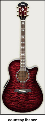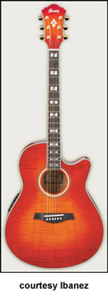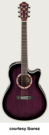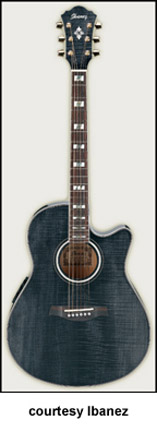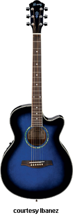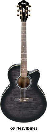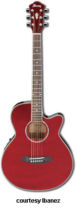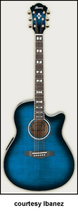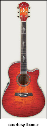 AEG10 | - similar to the AE10 except has a Fishman Sonicore pickup and Ibanez AEZ-SS electronics, available in Gloss Black, Metallic Red (2007-08), Trans. Blue Sunburst (new 2009), Trans. Red Sunburst (disc.), Trans. Purple (disc.), or Vintage Sunburst finish, mfg. 2001-present. |