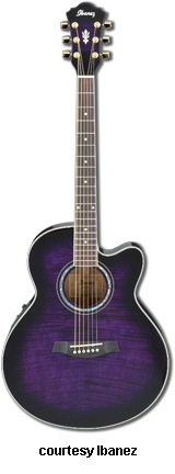 AE30 TP | - similar to AE18, except has flame maple top, maple back and sides, abalone/pearl block fingerboard inlays, gold hardware, Fishman Sonicore pickup and Ibanez AEQ40 four-band EQ, available in Trans. Purple finish, mfg. 1999-2001. |