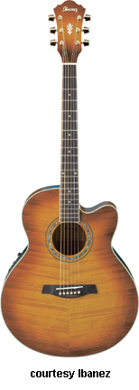 AEF30 | - single cutaway body, flamed maple top, arched maple back, mahogany neck, 14/21-fret rosewood fingerboard with block abalone inlay, rosewood bridge, Ibanez B-Band pickupand AEQ-SSR EQ, gold hardware, available in Cherry Violin (2006-08), Marine Sunburst, Orange Sunburst (disc.), Trans. Violet Sunburst, Trans. Black, or Vintage Violin (2006-08) finish, mfg. 2004-08. |