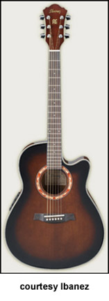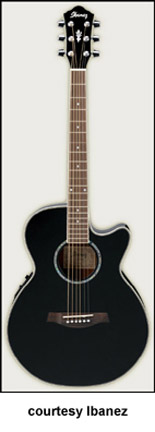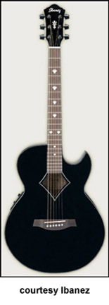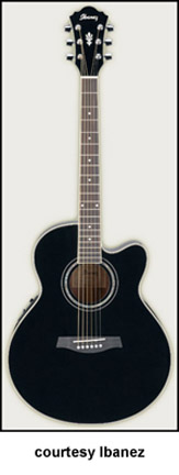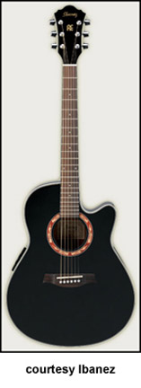 AES20E CUTAWAY ELECTRIC | - single sharp cutaway mini-jumbo body, spruce top mahogany back and sides, body binding, diamond shaped soundhole with abalone rosette, 14/21-fret rosewood fingerboard with diamond inlay, matching headstock with three-per-side tuners, rosewood bridge, Fishman Sonicore pickup, Ibanez AEQ-SST electronics, chrome hardware, Black High Gloss finish, mfg. 2005-present. |