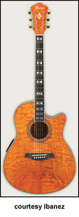 AEF37 | - single cutaway body, quilted maple top/back/sides, mahogany neck, 14/21-fret rosewood fingerboard with block abalone inlay, rosewood bridge, Ibanez B-Band pickupand AEQ-SSR EQ, gold hardware, available in Sunset Gold or Trans. Cherry Sunburst finish, mfg. 2004-08. |