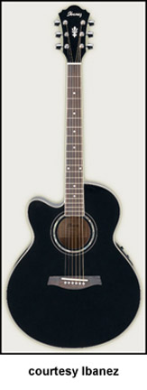 AEL10 | - single cutaway AEL body, spruce top, mahogany back/sides/neck, 14/20-fret rosewood fingerboard with dot inlay, Fishman Sonicore pickup, Ibanez AEQ-SS EQ, chrome hardware, available in Black finish, mfg. 2004-present. |