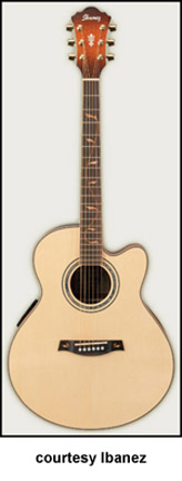 AEL50SE CUTAWAY ELECTRIC | - single cutaway AEL body, solid spruce top, flamed sycamore back and sides,maple body and neck binding, round soundhole with abalone rosette, mahogany neck, 14/20-fret rosewood fingerboard with wood vine inlay, three-per-side tuners, rosewood bridge with inlay, Ibanez B-Band SQR pickup, Ibanez AEQ-SRT electronics, gold hardware, available in Natural Resonant Low Gloss finish, mfg. 2005-present. |