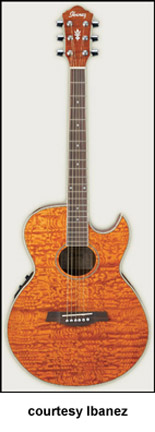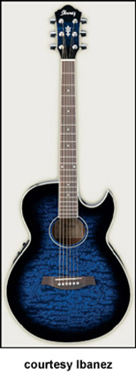 AES10E | - single sharp cutaway mini-jumbo body, quilted ash top/back/sides, body binding, 14/21-fret rosewood fingerboard with dot inlay, matching headstock with three-per-side tuners, rosewood bridge, Fishman Sonicore pickup, Ibanez AEQ-SST electronics, chrome hardware, available in Amber or Trans. Blue Sunburst High Gloss finish, mfg. 2005-present. |