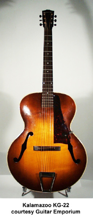KG-22 | - acoustic archtop, carved spruce top, carved maple back and sides, pickguard, binding on body, rosewood fingerboard with dot inlay, adjustable bridge with trapeze tailpiece, Gibson L-50 size, 16 in. wide, Sunburst finish, mfg. 1940-1942. |