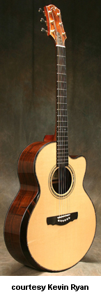 KEVIN RYAN GUITARS | Instruments currently produced in Westminster, CA since 1989. | Luthier Kevin Ryan builds high quality instruments in California. Ryan's models use newer technology to accommdate today's demands such as scale length to complement alternate tunings and light bracing. Many woods and options are available. For more information and to order a guitar contact Ryan directly (see Trademark Index). | |