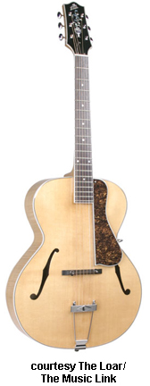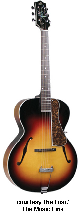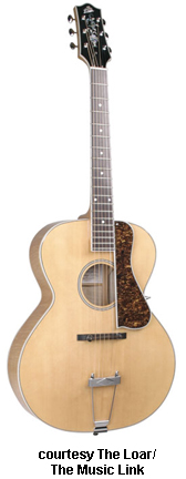 LOAR, THE | ACOUSTIC | | LH-200 | - small 1930s-style body, solid spruce top, mahogany back and sides, round soundhole with single ring rosette, ivoroid binding, 14/19-fret rosewood fingerboard with dot inlays, bound black headstock overlay with flower pot or fern abalone inlays, three-per-side chrome Butterbean tuners, rosewood bridge, black pickguard, available in Natural or Sunburst finish, 25.5 in. scale, new 2008. |