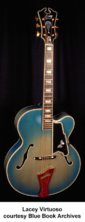 LACEY GUITARS | Instruments currently built in Kingston Springs, TN. | Luthier Mark Lacey studied formal training in musical instrument technology at the London School of Design, and Lacey has been repairing and building fine instruments since 1974. During that time, he spent two years at Gruhn Guitars in Nashville, TN, where he gained insight from noted vintage guitar expert George Gruhn. Lacey's flattop guitars start at $8,000 and archtops start at $9,000. The top-of-the-line archtop starts at $25,000 and several options are available. For more information or to order visit Lacey's website or contact him directly (see Trademark Index). | |