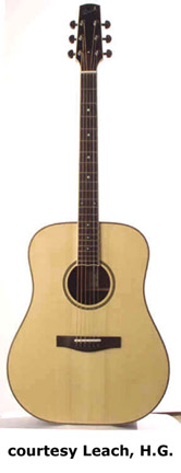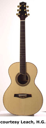 LEACH, H.G. | Instruments currently built in Cedar Ridge, CA. | Harvey G. Leach has been building acoustic guitars for over twenty-five years. Leach, a former furniture maker from Vermont, began building banjos and mandolins early on in his musical instrument career. In 1979, he built his first guitar, and then gave it to his wife as a wedding present. All H.G. Leach guitars are individually handcrafted, and built to the owner's specifications. He estimates that twenty to twenty-five guitars are built each year; a basic model may take a week's worth of work (spread out over a three-week time period), and a fancier model with mother-of-pearl inlays may take five times as long. Leach decided that he wanted to focus more time on his inlay work and started the company Cutting Edge Inlays. This reduced his building to only about twelve guitars instead of thirty a year. Leach is also committed to environmental concerns, and produces his guitars with domestic or foreign sustainable yield mahogany and Brazilian (or Bolivian) rosewood. Leach also uses a water-based lacquer finish (a nitrocellulose finish is available on request). Luthier Leach offers a wide range of inlay, abalone trim, wood appointments, and other options to all of his creations (the list is two columns long!). As a result, the custom-ordered guitar is a custom-built guitar, right to the customer's specifications. All list prices include a hardshell case. For more information, visit Leach's website or contact him directly (see Trademark Index). | | ACOUSTIC |