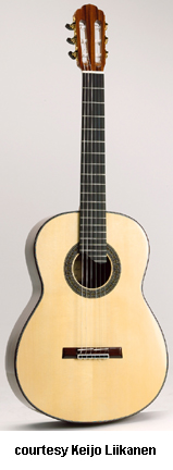 LIIKANEN GUITARS | Instruments currently built in Helsinki, Finland, since 1986. | Liikanen Musical Instruments ky is a company formed by three experienced luthiers to construct high class concert acoustic guitars. The company was founded by Kauko Liikanen in 1986, who has been building guitars for more than twenty years. Kauko's brother, Keijo Liikanen, joined the company in 1990. A German guitar teacher Uwe Florath joined the team in 1999. In 2000, the company invented and patented new construction for acoustic guitar top. Since then every Liikanen guitar is build with new "Lens Resonance System top." Models include six-string, seven-string and ten-string classical guitars as well as an eleven-string alto guitar. For further information regarding specifications and pricing, contact Liikanen Musical Instruments directly (see Trademark Index). | |