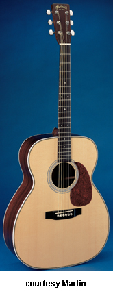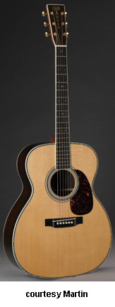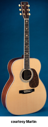 J-40(M) | - jumbo body style, solid spruce top, solid East Indian rosewood back and sides, round soundhole with three-ring (5/9/5 grouping, 1985-1995) or Style 45 abalone pearl rosette (1996-present), eight-ply top binding, four-ply back binding with white outer layer, mahogany neck, 14/20-fret bound ebony fingerboard with reduced abalone pearl hexagon inlays, unbound headstock with rosewood overlay and regular logo (1985-1995) or bound headstock with rosewood overlay and select abalone pearl Martin block logo, three-per-side gold tuners, ebony bridge, white bridge pins with abalone pearl dots, black pickguard (1985-1995) or tortoise pickguard (1996-present), available in Natural or Sunburst (optional) polished gloss finish, 25.4 in. scale, mfg. 1985-present. |
