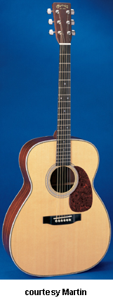 MARTIN | Acoustic: Standard Grand Auditorium (0000/M) Series | Size M guitars feature a lower bout width of 16 in., a body depth of 4.125 in.ches, 20.125 in. length, and 25.4 in. scale. | 0000-28H | - grand auditorium 0000 body style, solid spruce top, solid rosewood back and sides, round soundhole with three-stripe Style 28 rosette (5/9/5 grouping), white body binding, herringbone purfling, zig-zag back inlay, mahogany neck, 14/20-fret ebony fingerboard with pearl dot inlays, rosewood headstock overlay with gold foil logo, three-per-side chrome tuners, ebony bridge, white bridge pins with black dots, tortoise pickguard, available in Natural finish, 25.4 in. scale, mfg. 1997-2000. |