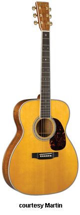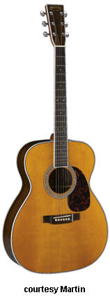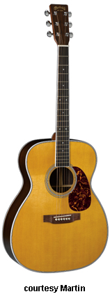 M-38/0000-38 | - grand auditorium 0000 body style, solid Sitka spruce top, solid rosewood back and sides, round soundhole with three-stripe Style 45 abalone pearl rosette (5/9/5 grouping), seven-ply top binding, three-ply back binding with white outer layer, zipper pattern back strip, mahogany neck, 14/20-fret bound ebony fingerboard with pearl dot inlays, bound headstock with rosewood overlay and gold foil logo, three-per-side chrome tuners, rosewood bridge, white bridge pins with black dots, tortoise pickguard, available in Natural finish, 25.4 in. scale, mfg. 1978-1997, reintroduced 2007-present. |