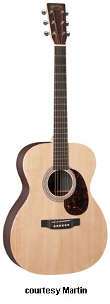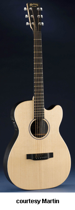OMCX1KE | - 000-style single cutaway body, solid Sitka spruce top, textured HPL koa patterned back and sides, multiple B/W boltaron rosette with red fiber, natural Stratabond neck, 14/20-fret East Indian rosewood fingerboard with no inlays, HPL koa patterned headstock overlay with standard logo, three-per-side chrome tuners with small buttons, belly East Indian rosewood bridge, no pickguard, Fishman Classic 4T electronics, available in Natural finish, 25.4 in. scale, mfg. 2008-present. |