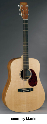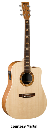 DX1 TAWNY SATINWOOD | - dreadnought style, solid Sitka spruce top, "Tawny Satinwood" HPL figured wood grain laminate back and sides, round soundhole with rosewood, maple and koa Art Deco rosette, natural Stratabond neck, 14/20-fret rosewood fingerboard with Style 45 maple hexagon inlays, "Tawny Satinwood" headstock overlay, three-per-side chrome tuners, rosewood bridge, available in Natural finish, 25.4 in. scale, mfg. 2007-present. |