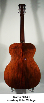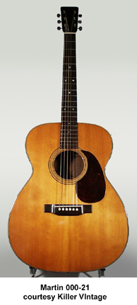 000-21 | - Grand Auditorium body style, solid spruce top, Brazilian rosewood (1902-1954, 1965) or Indian rosewood (1979) back and sides, round soundhole with three-stripe rosette (herringbone surrounded by two five ring groupings between 1902 and 1947, non-herringbone with 1/9/1 grouping after 1947), five-ply top binding, two-ply back binding with rosewood (1902-1932), black (1932-36, 1979), or tortoise (1936-1954, 1965) outer layer, herringbone back stripe (1902-1948), cedar (1902-1916) or mahogany (1916-1954, 1965, 1979) neck, 12/19-fret (1902-1934) or 14/20-fret (1934-1954, 1965, 1979) ebony (1902-1947) or rosewood (1947-1954, 1965, 1979) fingerboard with slotted diamond inlays (1902-1944) or pearl dot inlays (1944-1954, 1965, 1979), slotted headstock (1902-1934) or solid headstock (1934-1954, 1965, 1979), with rosewood overlay and raised gold foil logo, three-per-side brass tuners with ivory buttons (1902-1934) or regular tuners (1934-1954, 1965, 1979), ebony rectangular (1902-1929) or belly (1929-1954, 1965, 1979) bridge, black bridge pins with pearl dots, available in Natural finish, 24.9 in. scale, total production of 9,005 instruments, mfg. 1902-1954, 1965, 1979. |